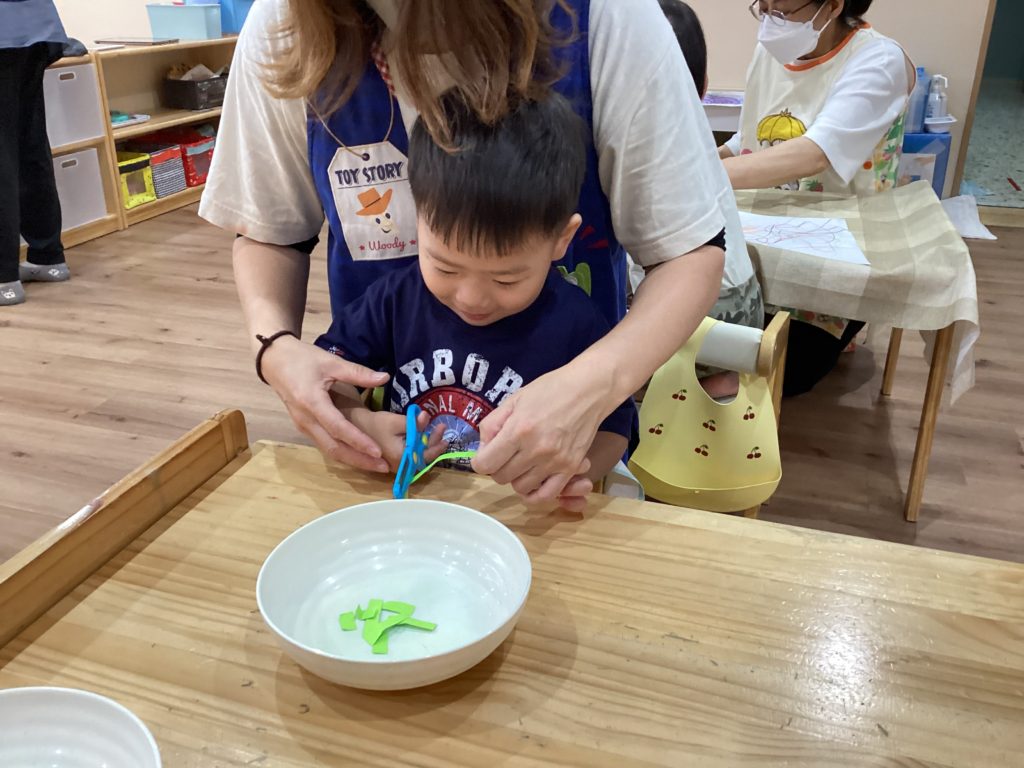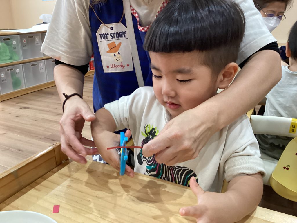 最初はぎこちない手つきも、慣れてくると保育者の補助なしでも上手にチョキン✂️出来るようになりましたよ✨