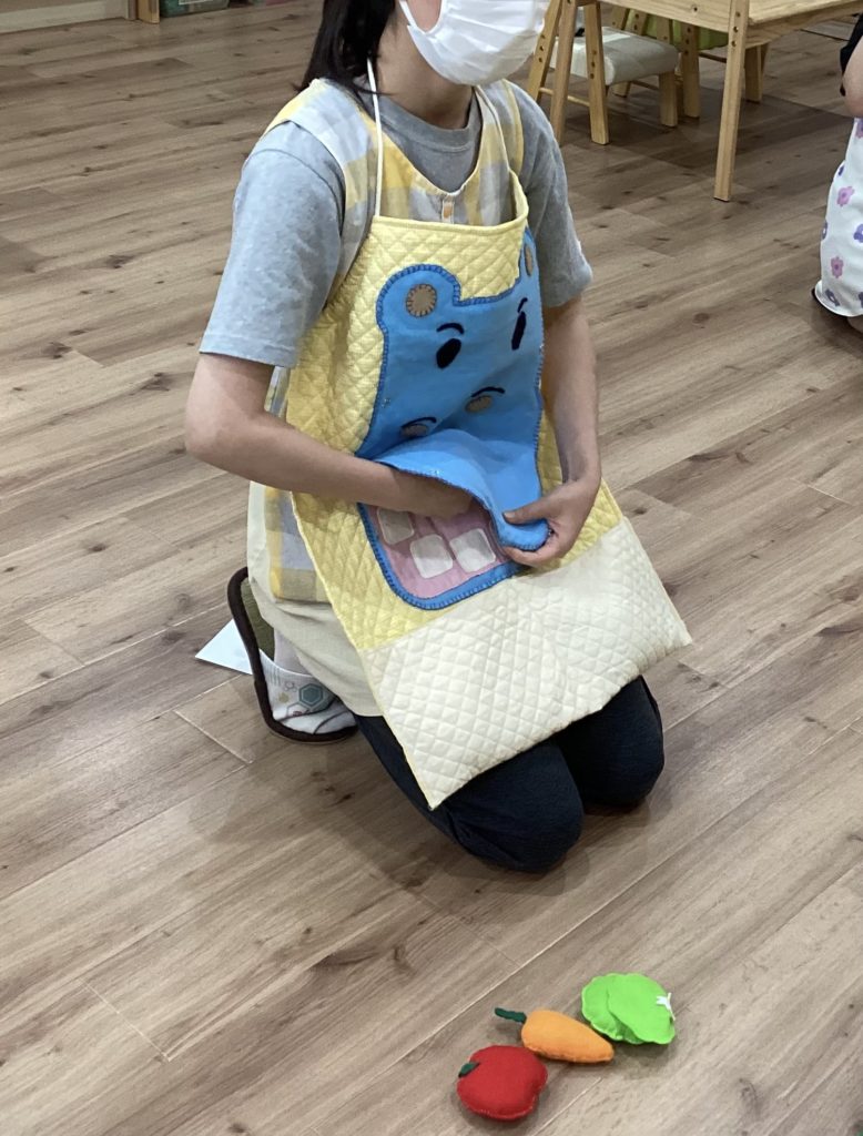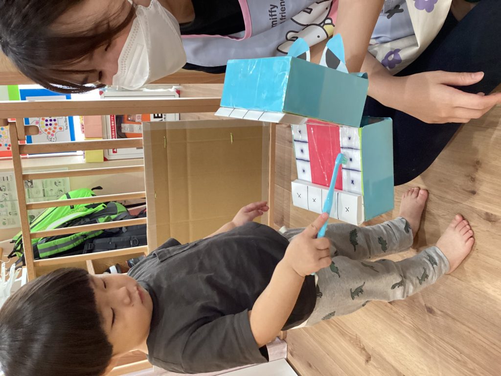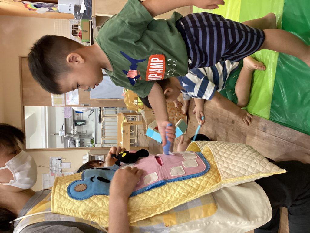 エプロンシアターのあとは、本物の歯ブラシでみんなもかば君のお口を