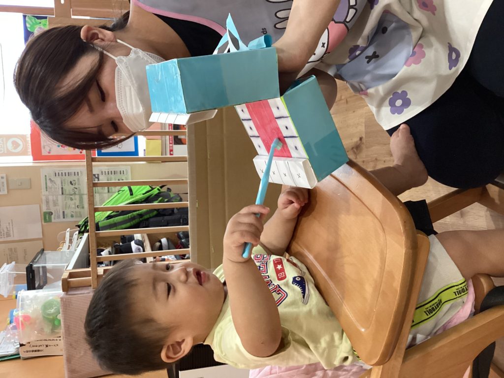 2歳児さんはお家から持ってきた歯ブラシで実際に自分の歯を磨いてみました😁