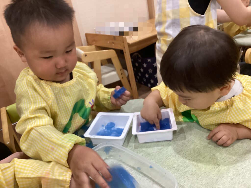 4月当初、ぬるぬるべたべた、手がぬれるのがイヤという思いを保育者に伝えていた子もいました。保育者やまわりの友だちの様子を見たり、一緒に遊びながら「ちょっとやってみようかな」と指一本だして触れることができるようになったことが懐かしく思います。