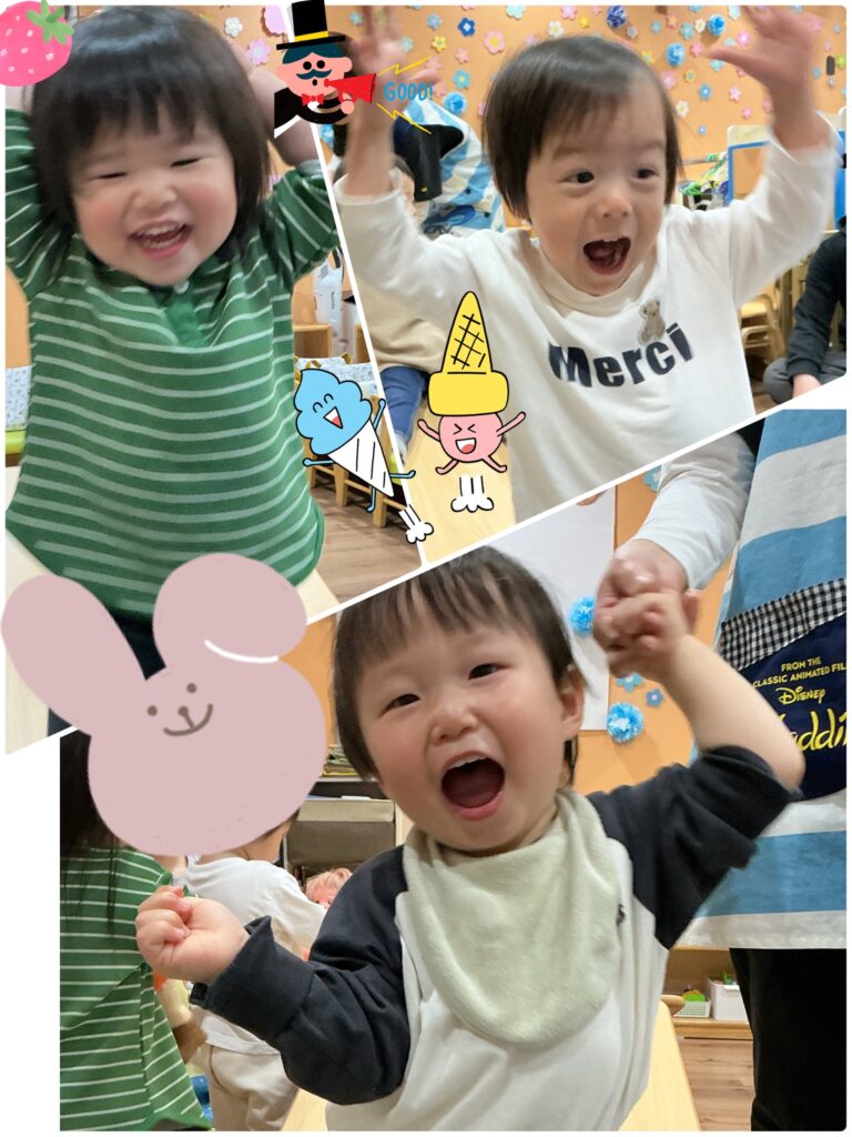 室内では、体を動かすことを楽しむ運動遊びを取り入れ、ハイハイや歩行など、それぞれの発達に応じた動きをのびのびと楽しんでいます。また、「ぽんぽんぽんとはるがきた」や「チューリップ」などの春の歌に触れ、保育者と一緒にやさしい歌声の中で季節を感じています。